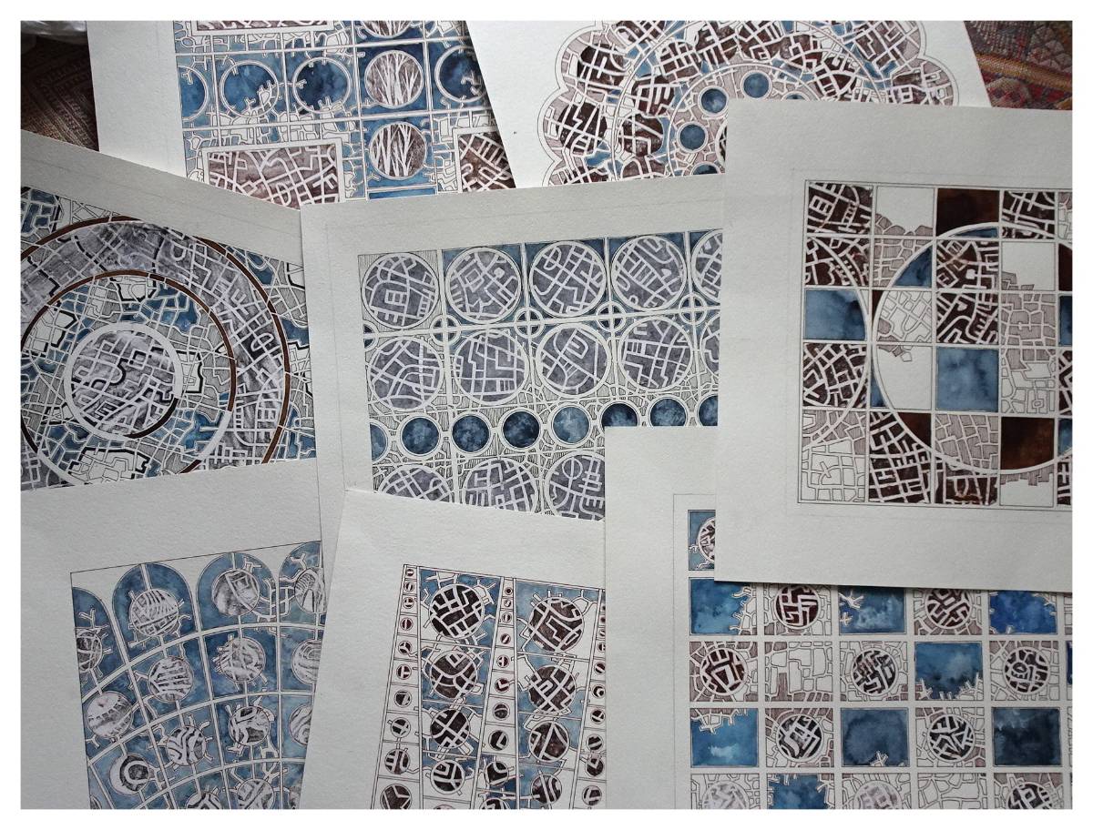 Plus géométrique, plus construite, elle fait toujours appel à l'aquarelle, à l'encre, au brou de noix.